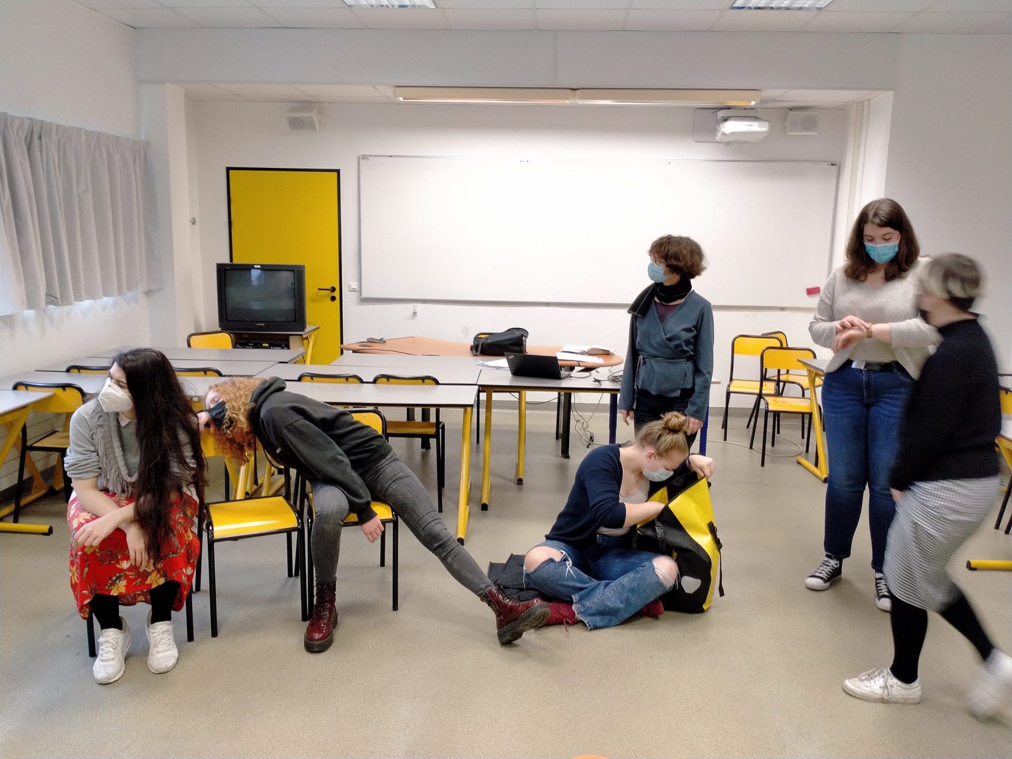 Les étudiantes ont expérimenté la création d’une forme théâtrale dans son ensemble : de l’écriture des textes à la mise en scène. Chacune était invitée à proposer les mots, les images et les gestes que lui inspirent le voyage, la découverte de l’ailleurs, de l’autre et de soi, en se nourrissant des propositions et de l’énergie de ses partenaires de jeu. C’est ce mélange des sensibilités et des propositions de chacune, transformées par le regard du groupe qui nous fait prendre conscience (à nouveau) de la force et de la beauté du collectif.