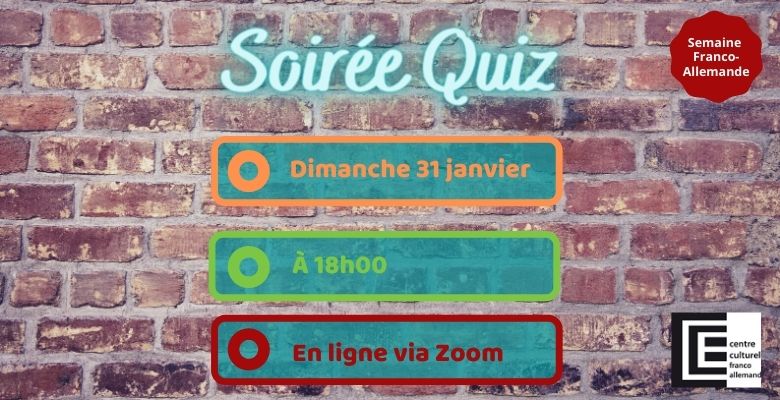 En ligne via ZoomL'équipe du CCFA vous prépare à votre prochain voyage en Allemagne avec un quiz franco-allemand. Vous répondez tous ensemble des questions sur l'Allemagne, sa langue, son histoire, ses traditions et les relations franco-allemandes... Connectez-vous sur Zoom et passez une soirée conviviale avec nous ! À noter : le quiz est un jeu en ligne. Pour […]